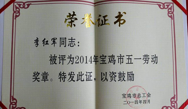 集團(tuán)公司李董事長(zhǎng)被寶雞市總工會(huì)授予2014年度五一獎(jiǎng)?wù)芦@得者,這是李總首次獲此殊榮。