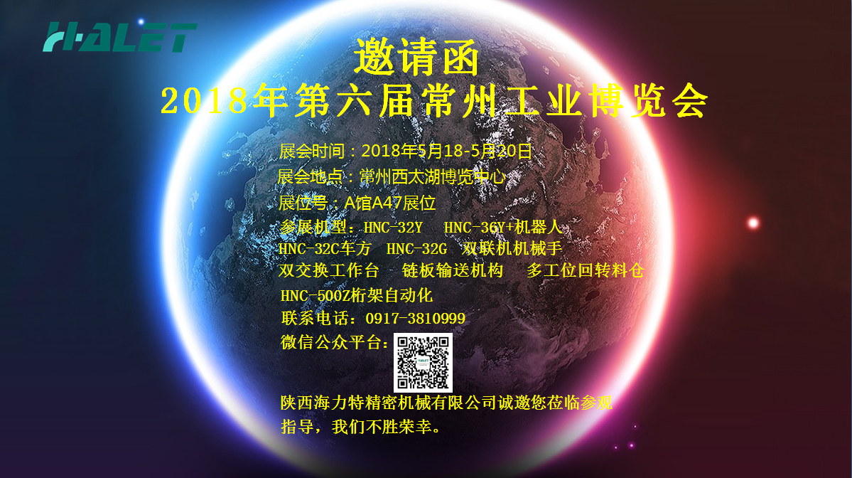 第六屆常州工業博覽會5月18日——5月20日在常州西太湖博覽中心隆重召開。此次展會陜西海力特精密機械有限公司將攜HNC-32Y,HNC-36Y精密車銑復合機床,HNC-32G HNC-32C車方 雙聯自動化機床,HNC-500Z桁架機械手,部分自動化單元參加此次行業盛會。海力特公司誠邀各界新老朋友蒞臨展位參觀指導,洽談合作,共創美好未來。