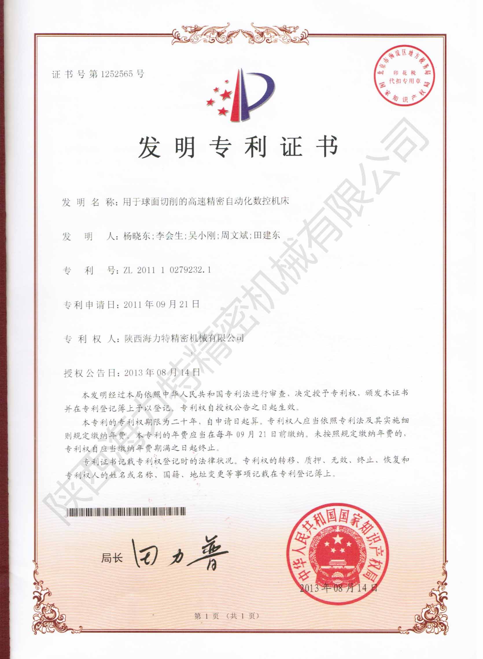 近日我公司自主研發的HNQ-50P數控球面在獲得國家發明專利授權又獲得陜西省科學技術廳省級成果登記一項。